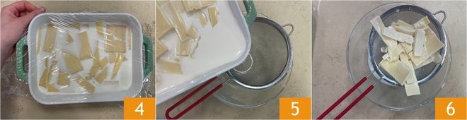 Cover with plastic wrap 4 and let rest in the refrigerator overnight. After the resting time, drain the cheese from the milk through a sieve 5 and set the milk aside 6.