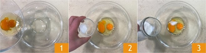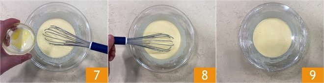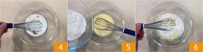 Mix the ingredients with a whisk 4, then incorporate the sifted flour 5 and stir well to avoid lumps 6.