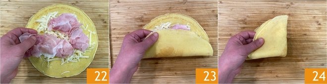 Also, place the ham slices 22 and fold the crêpe first in half 23 and then in half again 24, forming a triangle. Proceed in this way to fill all the crêpes.