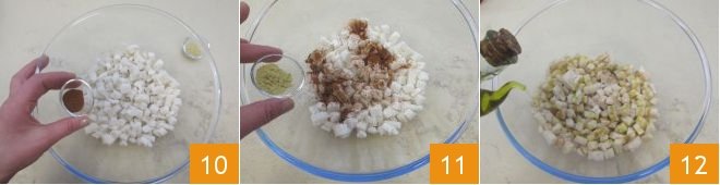 and place them in a bowl; then add the sweet paprika 10, mustard powder 11, salt, pepper, and oil 12.