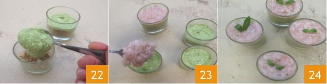 another layer of pesto 22, and finally the last layer of scampi tartare 23. Decorate with basil leaves 24 and your tart in a glass is ready to be served!
