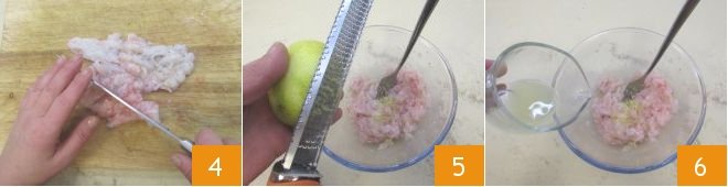 Finely chop the scampi with a knife 4, then place them in a bowl and grate the lemon zest 5, then squeeze the juice, filter it, and pour it over the fish 6.