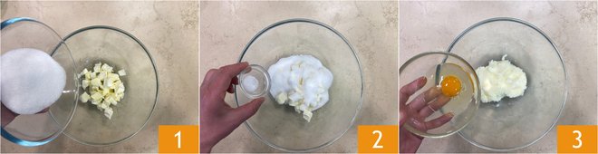 To prepare the apple and caramel tart, pour the butter, sugar 1, and salt 2 into a bowl, knead by hand then add the egg 3.