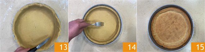 Trim the edge with a knife to lower it 13, prick the bottom 14, bake in a preheated static oven at 356°F for 15 minutes. Once cooked, remove from the oven and let cool 15.