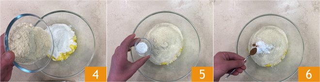 Now incorporate the flours 4, baking powder 5, and cinnamon 6.