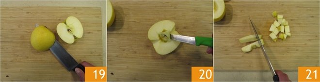 Move on to the apples: wash them well, cut them in half 19, and remove the central core 20. Cut them into cubes of about 0.4 inches, without peeling them 21.