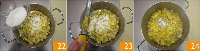 Transfer them to a pot, add the granulated sugar 22, and the zest of one lemon 23. Cook over high heat for about 5 minutes. When the apples are soft, but still whole, turn off the heat and let them cool at room temperature 24.