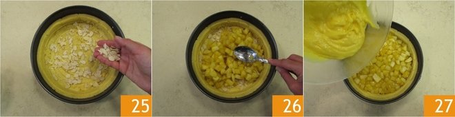 Level with a spoon 28 to smooth the surface. Add another 1 oz of sliced almonds on the edges and bake in a preheated static oven at 350°F for 45 minutes. When it is well browned, take it out of the oven 30.
