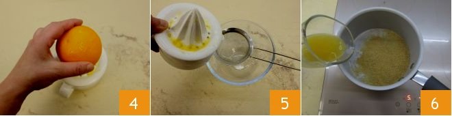 Then squeeze the juice of an orange 4 and strain it through a fine mesh sieve, collecting the juice in a small bowl 5. Pour it into the pan 6. Heat gently for a few minutes, stirring well to dissolve the sugar.