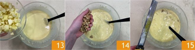 Add the diced apples 13, some of the roughly chopped walnuts 14, lemon zest 15, and a pinch of salt. Combine everything.