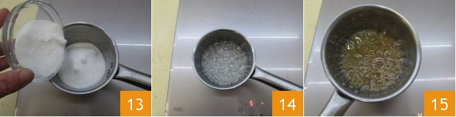 Now take care of the caramel: place a pot on the stove, pour in the sugar a little at a time 13 and let it melt 14 and brown 15 over low heat. Do not stir the sugar during this phase of preparation, but only rotate the pot.