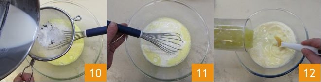Strain the milk and cream mixture directly into the bowl with the eggs 10, mix with a whisk 11, and also incorporate the apple puree 12.