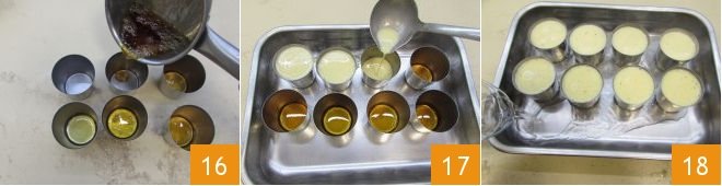 Pour the caramel thus obtained at the bottom of the molds 16, let it solidify at room temperature, and finish filling the molds with the base mixture 17. Place them inside a baking dish and add boiling water 18 until it covers a third of the mold.