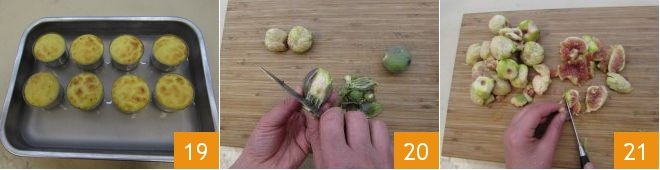 Bake in a preheated static oven at 356°F for about 60 minutes. Then take out the crème caramel, let them cool, and place them in the refrigerator for about 3 hours. At this point, make the fig sauce: peel them 20 and cut them into pieces 21.