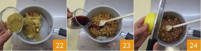 Transfer them into a saucepan along with the brown sugar 22, let it melt over low heat and add the red wine 23. Also, add the finely grated lemon zest 24 and stirring often, cook it all for another 10 minutes.