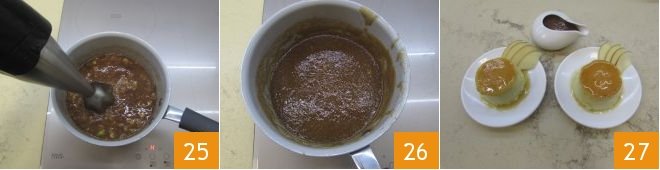 Blend the obtained compote with an immersion blender 25 until you get a smooth sauce 26. When serving, flip the crème caramel onto a small plate. To extract it, simply detach the parts of the cream from the mold, helping yourself with a small knife, and flip it. All that's left is to serve your apple crème caramel with fig sauce 27.