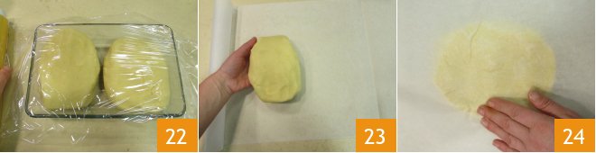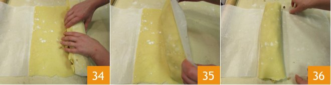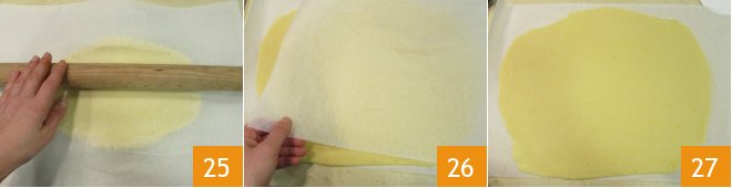 Help yourself with the rolling pin 24 to obtain a uniform thickness of about 0.2 inches. Then open the sheet 26 and with the back of a knife blade, trim the edges to get a precise rectangle of the indicated dimensions 27. You can reattach some scraps to the dough and continue rolling.