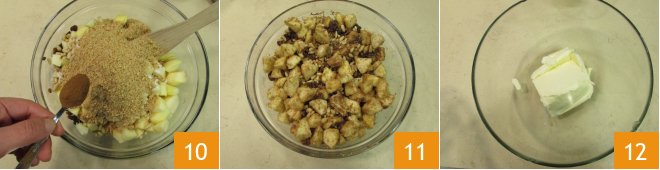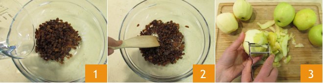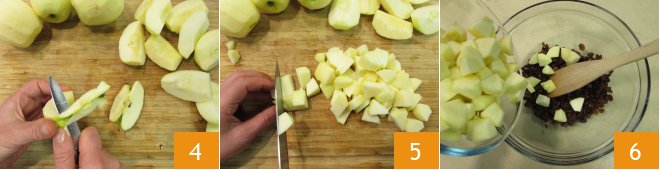 Then cut into quarters and remove the central core 4. Cut each wedge in half and then make rather large but uniform pieces 5. In the cooked strudel, the apple should be noticeable. Add the apples to the raisins 6 and mix again.
