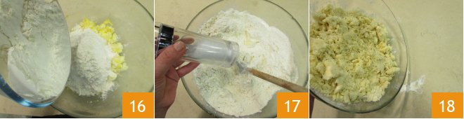 You should get a homogeneous cream; only then add the flour all at once 16, mix slightly with a spoon to start, and add a pinch of salt 17. Continue mixing until you obtain a homogeneous consistency. Then, using a dough scraper, transfer the dough onto a work surface 18.
