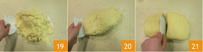 The dough will be very soft, but that's how it should be. Still using your hands and the scraper, continue to work the dough gently 19, gradually trying to shape it into a loaf. Once obtained 20, divide it in half 21; with this dose, in fact, you will prepare 2 strudels.