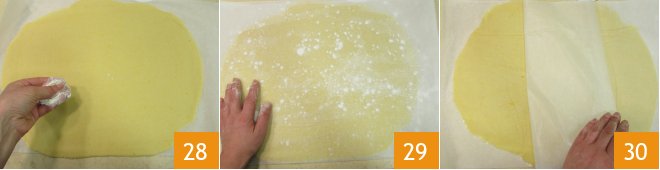 Dust the pastry with some flour 28, cover with parchment paper 29, and carefully turn everything over. Open the sheet again 30