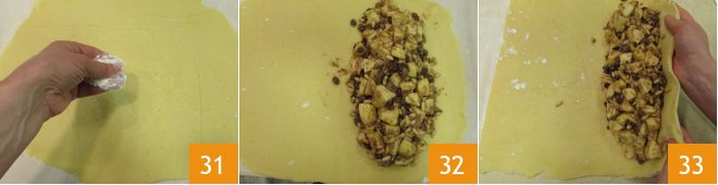 and sprinkle the other side with a bit of flour 31. Cover again. Carefully transfer to a tray (or directly to the baking sheet) and place in the refrigerator for 6-7 minutes. Meanwhile, repeat the same operation for the second piece of shortcrust pastry. At this point, retrieve the first sheet, which will have rested by now. Now all that's left is to fill the strudel. You can slightly trim the pastry again, then take the filling and place some on one side of the pastry, leaving a free edge. You should create a long strip, about 4 inches wide and 2 inches high 32. Now, always using the parchment paper, lift the dough and start rolling it over the filling 33.