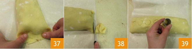 After making the first turn, always with the paper on the pastry, press it lightly with your hands to make the filling more homogeneous and adhere the pastry well 34. Continue in this way 35 until it is completely rolled 36.