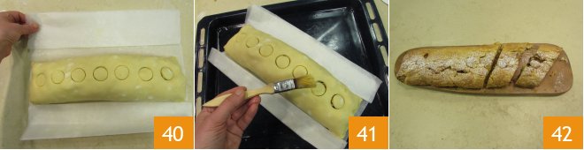 Fold the parchment paper a couple of times on the sides to reinforce it 40 and transfer it to a baking tray 41, so you'll use the same paper for cooking. Brush the surface of the strudel with a lightly beaten egg. Heat the oven to 392°F, in static mode; then insert the strudel and immediately lower the temperature to 356°F, continue cooking for 40 minutes. Do the same for the second strudel. Once cooked, take out the first strudel and let it cool slightly before cutting and serving it 42.