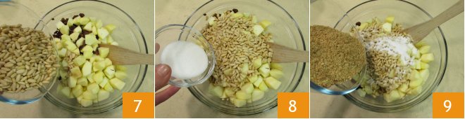 Add the pine nuts 7 and the sugar 8. Blend the cookies with a mixer until you get a powder, then add it to the apples 9.