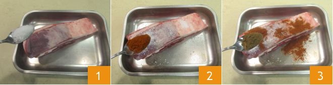 To prepare the meat-stuffed arepas, first take care of the marinade: place the brisket in a baking dish and season with salt 1, paprika 2, cumin 3, and pepper.