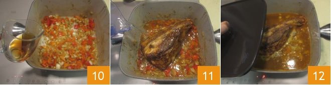 After about 5 minutes, deglaze with rum and let it evaporate 10, then return the meat to the saucepan and add the water 11. Cover with the lid 12 and cook over medium heat for about 2 and a half hours.