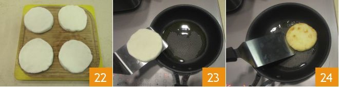 Place the obtained discs on a cutting board and shape them with your hands to achieve a regular shape 22. Heat a couple of tablespoons of vegetable oil in a pan and cook the arepas over medium heat for 4 minutes on one side 23 and 3 minutes on the other 24: they should be golden with darker spots. After cooking them, set them aside momentarily, covering them with a towel.