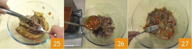 When the meat is cooked, transfer it to a bowl and shred it with a fork, removing the fat and bones 25, then add the cooking broth with the vegetables 26 and mix everything well 27.
