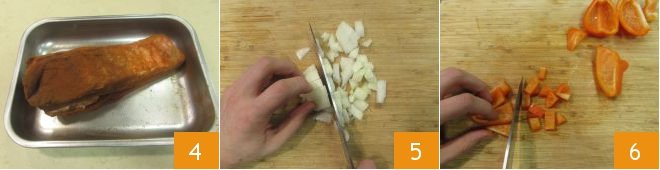 Massage the meat well on each side and let it marinate at room temperature for at least 2 hours 4. Meanwhile, peel the onions and the pepper and cut them into cubes (5-6).