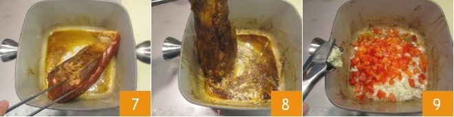 After the marinating time, heat the oil in a saucepan and brown the meat on all sides over high heat for a total of 10 minutes (7-8). Set the meat aside momentarily and add the onions and peppers to the same saucepan, add the crushed garlic clove 9 and mix well to flavor everything.