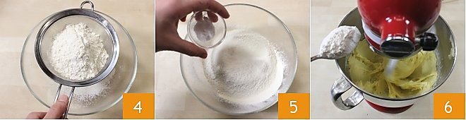 Sift the flour 4 and add the baking soda 5 together, then add them to the mixture one tablespoon at a time 6, continuing to mix until the dry ingredients are well incorporated into the mixture.