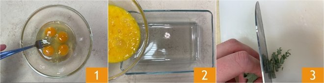 To prepare the aromatic Milanese veal cutlet, start with the breading: beat the eggs 1 and pour them into a shallow dish 2, then chop the sage leaves with a knife 3.