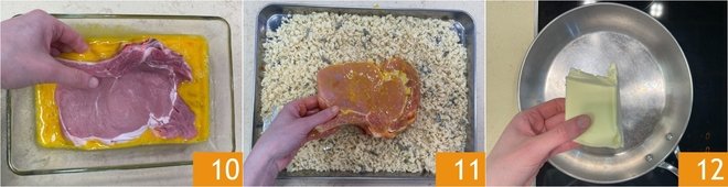 Now take the veal cutlets and press them lightly with your hands; if necessary, score the cartilage along the edge to prevent them from curling during cooking. Dip the cutlets first in the egg 10 and then in the breading 11, making sure to coat them well on both sides. Let the breaded cutlets rest for about 10 minutes so the coating will adhere well to the meat. After this time, melt the butter in a large skillet 12.