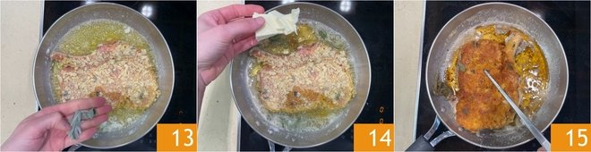 When the butter begins to sizzle, lay the cutlet in the pan. Flavor with the remaining sage leaves 13 and cook over medium heat for about 4-5 minutes. Add the remaining butter during cooking to lower the temperature and prevent it from burning 14. Once well browned, turn the cutlet to the other side and continue cooking for another 4-5 minutes 15.