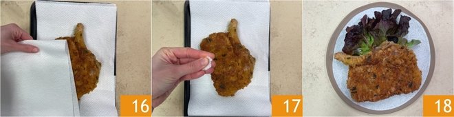 When you have achieved an even, crispy golden color, drain the cutlet on paper towels, pat well 16 and let rest for 4 minutes 16. Finally, salt to taste 17. Your aromatic Milanese veal cutlet is ready to be served 18!