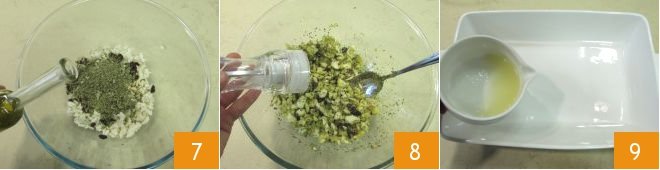and also add about two tablespoons of water 10. Place the cod pieces 11 and season them with the previously prepared breadcrumb mixture 12,