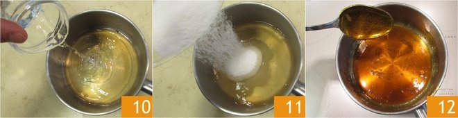 Set the filling aside and prepare the sweet and sour sauce: pour the vinegar and water into a saucepan 10, add the sugar 11, and reduce over medium heat until it reaches a honey-like consistency 12.