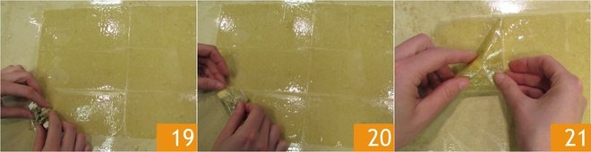 Brush the second sheet with oil as well 16, then flip the two sheets together 17 to brush the base too. You have completed the first piece made of two phyllo sheets: proceed in pairs like this for the others, to obtain 4 pieces in total. Using a pastry cutter, divide each of these double sheets into 3 strips of 2x12 inches, lengthwise 18: in total, you will have 12 rectangles.
