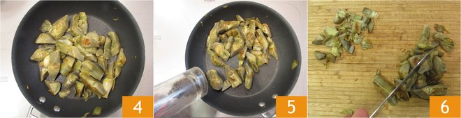 When the artichokes are golden 4, lower the heat and cook for a few more minutes, then salt and pepper 5. Roughly chop the artichokes 6 and transfer them to a bowl.