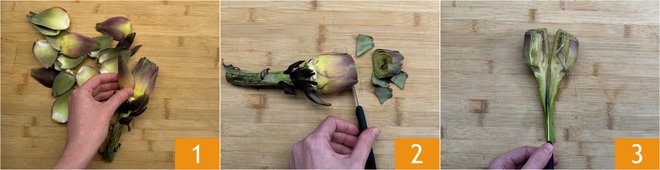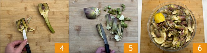 Remove the inner choke 4. Cut the hearts into wedges and the stem into slices 5. As you clean them, immerse them in acidulated water 6 to prevent them from darkening.