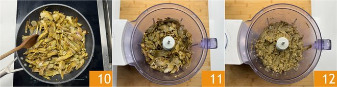 Remove the lid and let dry for 4-5 minutes 10, stirring as little as possible so the artichokes maintain a nice color. Allow to cool slightly; you can remove the garlic or leave it depending on your taste. Transfer everything to a mixer 11 and blend until you get a homogeneous mixture 12.