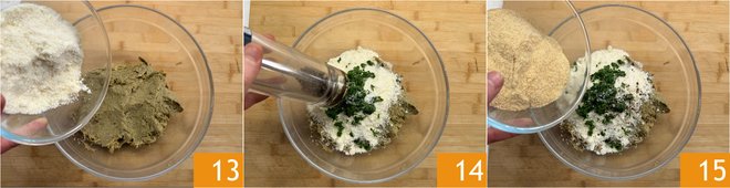 In a bowl, place the blended artichokes and add the pecorino cheese 13, chopped parsley, and season with salt and pepper 14. Add the breadcrumbs 15 and mix.