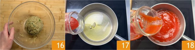 You should obtain a homogeneous mixture 16. Let it rest in the fridge for 1 hour. Meanwhile, prepare the sauce. In a pot, sauté the garlic for a few minutes, then add the tomato puree 17 and a little water to rinse the container 18.
