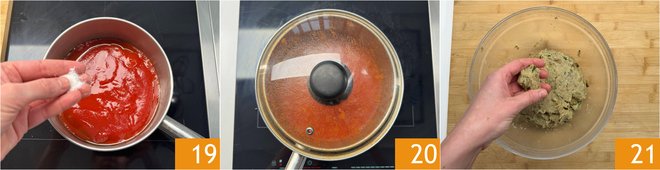 Season with salt 19, cover with a lid 20, and cook for 15 minutes, stirring occasionally. Moisten your hands, form the meatballs by taking 20g of mixture at a time 21.