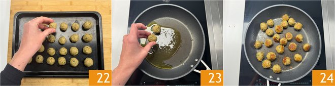 Place them on a tray 22. In a non-stick pan, pour a drizzle of oil, add the meatballs 23 and brown them for 5 minutes, moving the pan to cook them on all sides 24.